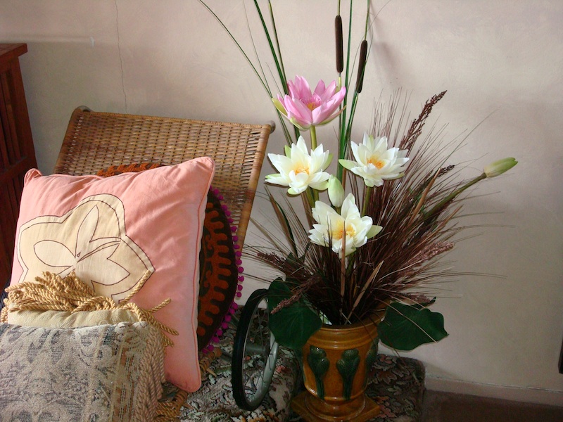 Park Avenue townhouse living room - Faux flower arrangement for giant Asian vase.