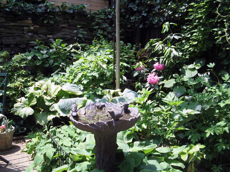 upper west side "woodland" shade garden - Birdbaths add elegance and attact birds