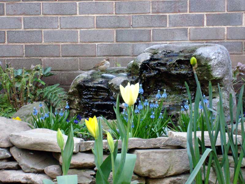upper west side apartment building - faux stone fountain (with visiting sparrow!) with rock wall - surrounded by blue-grape hyacinth, yellow tulips, ferns