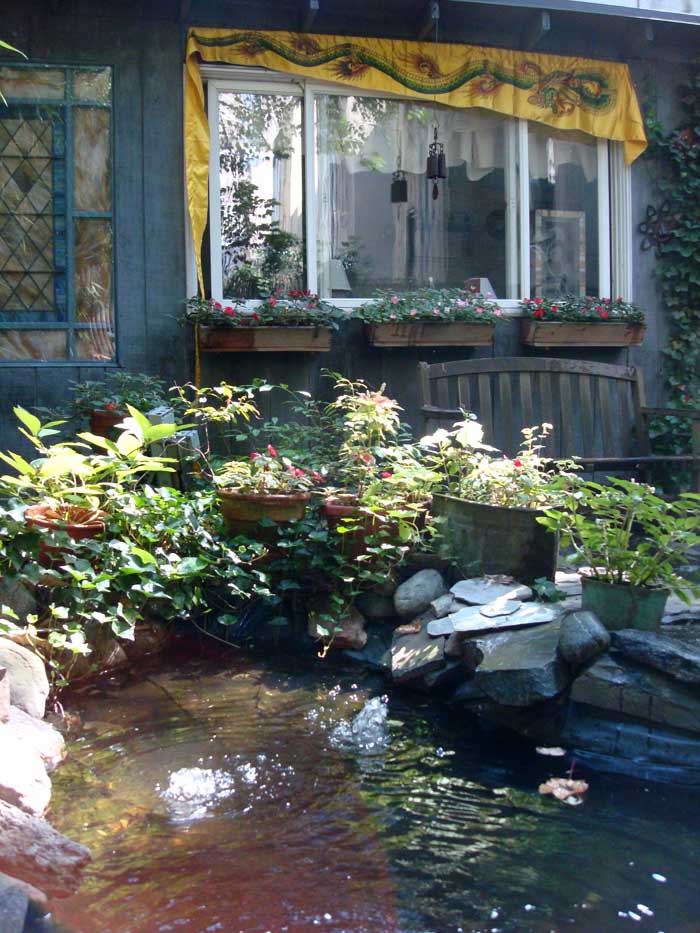 upper west side townhouse backyard area - guest house & garden pond - with bamboo grove & potted flowers