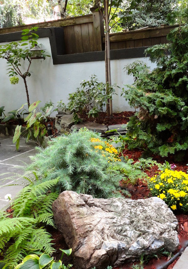 a moss rock adds interest and contrast to this Chelsea backyard shade garden