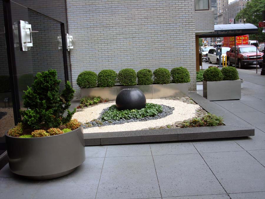 surrounding black polished granite fountain - with English Ginger and Winterberry ground covers, mosses, miniature ferns, boxwoods and asian evergreen tree
