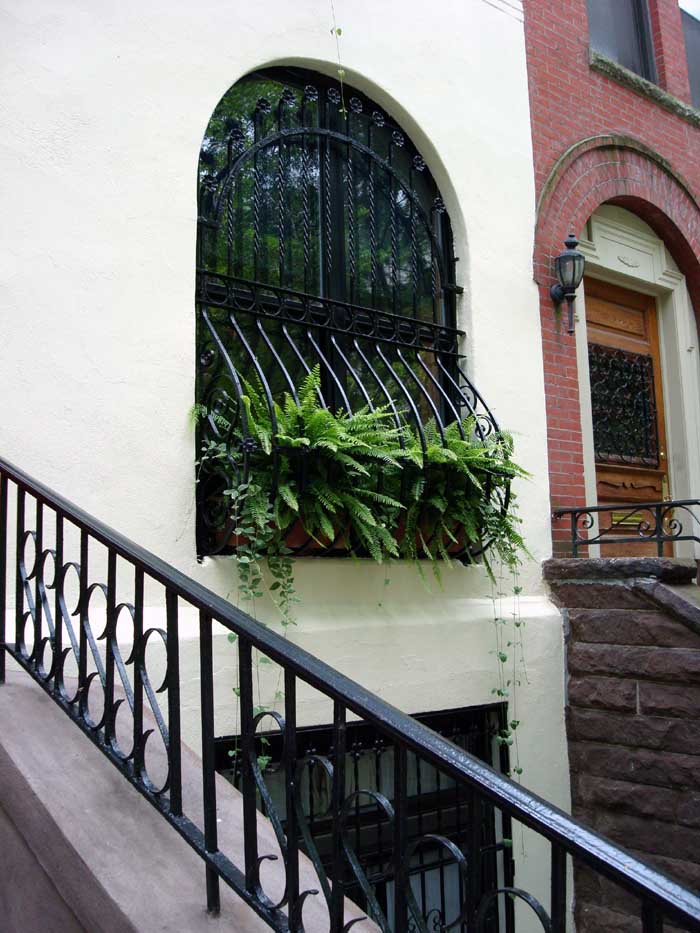 Upper West Side - summer - window box planting - Boston ferns and Vinca vinces