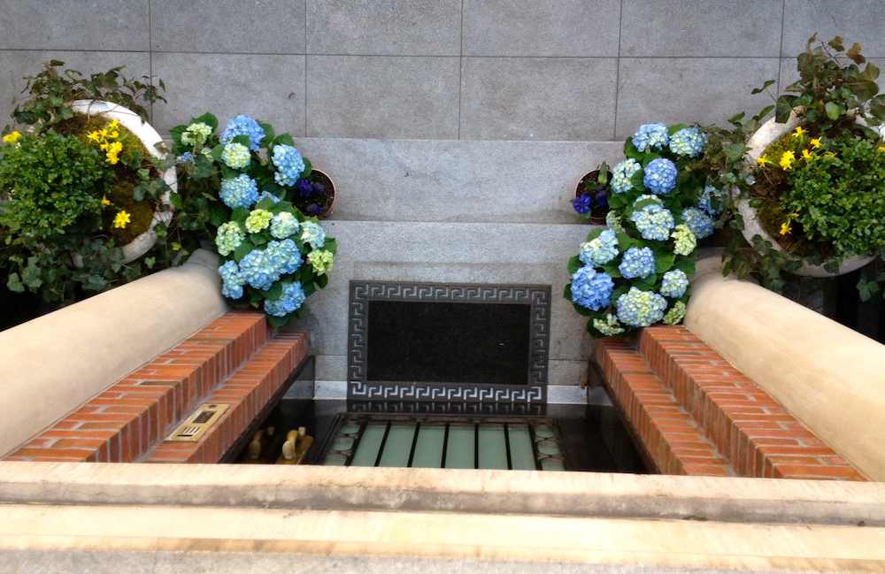 upper east side townhouse front steps in Spring - blue hydrangeas and daffodils
