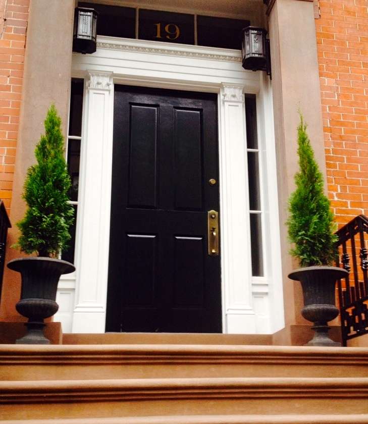West Village townhouse front steps - Arborvitae trees in urns