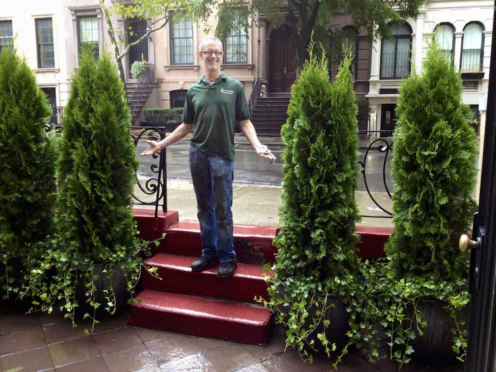 east 60's townhouse front - Arborvitae trees and English Ivy in containers