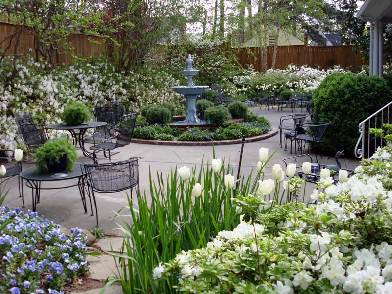 Westchester NY backyard garden in spring - with white tulips, white azaleas, blue pansies